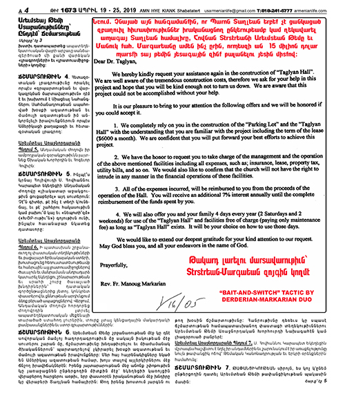 ՃՇՄԱՐՏՈՒԹԻՒՆ 6. Արեւմտեան Թեմը շրջանառութեան մէջ կը դնէ սովորական մամլոյ հաղորդագրութիւն մը սակայն իսկութեան մէջ սուտերու շարան մը, ճշմարտութիւնը խեղաթիւրելու եւ միաժամանակ ծխականներունպարտադրելով՝ չկիրարել խօսքի ազատութեան եւ մամուլի ազատութեան իրավունքները: Մեր հայ հայրենակիցները եկած են Ամերիկայ ազատութեան համար, խոյս տալով այլերկիրներու մէջ ճնշող իրավիճակներէն: Իրենց յայտարարութեան մեջ անոնք շփոթութիւն կը յառաջացնեն ընթերցողին միտքին մէջ եկեղեցիի կառոյցին վերաբերող հարցերու առթիւ, երբ փաստօրէն իրականութեան մէջ խնդիրը կը վերաբերի Տաղլեան համալիրին: Թող իրենց խոստում յարգեն ու թող խօսին ճշմարտութիւնը։ Հանրութիւնը դեռեւս կը սպասէ ճշմարտութեան համապատասխանող փաստացի տեղեկութիւններու Արեւմտեան Թեմի Առաջնորդական Խորհուրդի Նախագահէն կամ լիազօրուած բանբերէ: