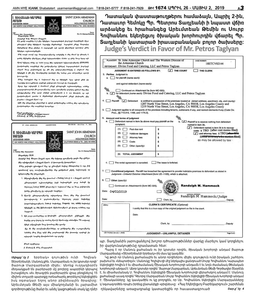 Այդ ժամանակներուն, պր. Տաղլեան իր բանկի հետ բանակցած է շարք մը վարկեր իրականանցնելու համար, օգտագործելով իր վարկային վիճակացոյցըիր ստորագրությամբ երաշխավորելով $15 մլն-ի շարք մը վարկերու համար: Արք. Տէրտէրեան եւ Մանուկ քհն. Մարգարեանի հետ անոր համաձայնութիւնը այն էր, որ պր Տաղլեան կը նախագծէր գոծառոյթային ծրագիր, որով ան կրնար վերահսկել եւ երաշխավորել վարկի ամբողջական վճարումը: Պրն Տաղլեան առաջարկած է. «Վարկը վճարելէ ետք ան ողջ համալիրը Եկեղեցիին կը վերադարձնէ որպեսզի եկեղեցին/առաջնորդարանը մշտապէս ստանան օգուտները: Ըստ համաձայնագրին, Պր. Տաղլեանի ղեկավարութեան ներքոյ՝ կը նախատեսուէր վարկի դիմաց վճարուող եկամուտներու կայուն հոսք: Երբ ամեն ինչ հունի մէջ մտած էր, հանկարծ Արք. Հովնան Տէրտէրեանի հաւանութեամբ միակողմանի կարգով որոշեցին Պր. Տաղլեանին ամբողջությամբ հեռացնել, որպեսզի եկամուտները միայն իրենք ստանան առանց ապահովելու վարկի մարումը եւ խախտելով վարկը վերադարձնելու հիմնական համաձայնութիւնը: 2019 թ. սկզբին, Անոնք գացին դատարան: Լոս ԱնՃելոսի Գերագոյն Ատեանի Դատաւոր Ռանդոլֆ Մ. Հեմոկը ուշադիր կերպով լսեց գործը: Դատական վարոյթի ընթացքին դատաւոր Հեմոկը ուղղակիօրէն հարցուց Արեւմտեան թեմի գործադիր տնօրէն Յարութ Մարգարեանին. «Եկեղեցին ի՞նչ կþընէ, եթէ մի քահանայ սուտախօսութեան համար կը բացայայտուի»: Յարութ Մարգարեան պատասխանեց. «Ան անմիջապէս կը զրկուի պաշտօնէն եւ փիլոնազուրկ կþըլլայ»: Մինչ Յարութ Մարգարեանը նման յայտարարութիւն կþընէր, ան պէտք էր լաւ տեղեակ ըլլալ այն բանի մասին, որ իր իսկ հայրը, Մանուկ Քհն. Մարգարեան կը պատրաստուէր դատարանի կողմէ հանցագործութեան վրայ բռնուիլ երբ ան դեռ եւս երդումի տակ էր դատարանի կողմէ: Մանուկ Քհն. Մարգարեան դատաւորի կողմէ ենթարկուեցաւ ստուգման ու փորձաքննութեան: Մի քանի հարցերու պատասխանելէ ետք Դատաւոր Հեմոկը յայտարարեց, որ չի գտներ որ Մանուկ Քահ. Մարգարեանի վկայութիւնը վստահելի է, եւ թէ՝ ան «անկեղծօրէն չի հաւատար Մանուկ Քհն. Մարգարեանի որեւէ ըսածներուն» եւ թէ պարզապէս Մանուկ Քհն. «ինքն իր կաշին կը փորձէր փրկել եւ իր յետոյքը ազատել»: Դատական փաստաթուղթերու համաձայն, Ապրիլ 2-ին , Դատաւոր Հեմոկը Պր. Պետրոս Տաղլեանի ի նպաստ վճիռ արձակեց եւ հրահանգեց Արեւմտեան Թեմին ու Սուրբ Հովհաննու եկեղեցւոյ ծխական խորհուրդին վճարել Պր. Տաղլեանի կատարած իրաւաբանական բոլոր ծախսերը: (Տես դատարանի որոշումը էջ՝ 3) Որպէս հետաքննող լրագրող, կարդալէ ետք Մարտի 11-ի Սուրբ Հովհաննու եկեղեցիի / Արեւմտեան Թեմի ընդդէմ Պետրոս Տաղլեան (թիվ 18STCV02144 գործի) դատարանի արդիւնքներու մասին աններդաշնակ մամլոյ հաղորդագրութիւնը, ես անմիջապէս կապ հաստատեցի Արեւմտեան Թեմի Թեմական Խորհուրդի Նախագահ փաստաբան Յովսէփ Կանիմեանի հետ: Դատի մասին, Պր. Կանիմեանէն լուսաբանութիւններ խնդրեցի ե-նամակով եւ գրանցուած ԱՄՆ փոստային նամակով։ Մինչեւ օրս անոնցմէ չեմ լսած: Ապա ուրեմն ինչու՞ ժողովուրդին միտքը պղտորելու միտումով հրապարակով կը բողոքեն ըսել՝ «կարգ մը լրատուամիջոցներ անճշտութիւններ կը տարածեն։ Թող խօսէին եւ պարզաբանէին։ Ես այն եզրակացութեան եկած եմ որ «Տէրտէրեանի երրեակ» գոյութիւն ունի Հովնան Տէրտէրեանի, Մանուկ քհն. Մարգարեան ու իր կրտսեր որդի՝ Յարութ Մարգարեանի միջեւ։ Անոնք ուղղակիօրէն մեղսակցած են բարերարի մը բողերը ապօրինի կերպով իւրացնելու սեւ ծրագրին բարերարին վրայ բեռցնելով 15 միլիոն տոլարի պարտքը ոտնահարել թորձելով եկեղեցիին իսկ օգտակար եղող անոր բիզնեսային ծրագիրը: Արեւմտյան Թեմի այս միակողմանի եւ չարամիտ գործողութիւնը ծանր եւ անել կացութեան տակ կը դնէր պր. Տաղլեանին յարուցանելով խոշոր դժուարութիւններ վարկը մարելու կամ կորցնե