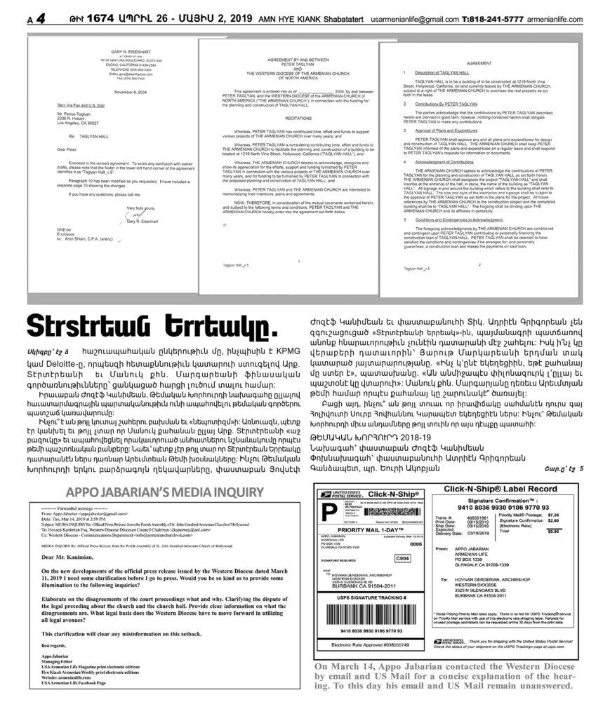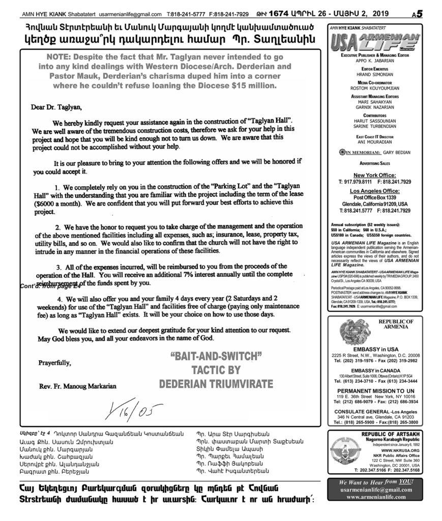 Հետեւաբար, մէկ անգամ եւս անոնք թակեցին Պր. Տաղլեանի դուռըխնդրելով նոր նուիրատւութիւն մը ըսելով թէ՝ եկեղեցին շատ վատ ֆինասական դրութեան մէջ է եւ թէ՝ չէր կրնար հողաշերտի վարձակալային ամսավճարը կատարել։ Նամակը մնաց անպատասխան։ (Տես էջ 3) Պր. Տաղլեան համաձայնեցաւ վարկ տրամադրել միայն այն պահին երբ եկեղեցւոյ ղեկավարները իրեն առաջարկեցին հետեւեալ պայմանները որոնք կþապահովէին ու կը հաւաստիացնէին Պր. Տաղլեանի կողմէ համալիրի պատշաճ կառավարումը հետեւեալ տրամադրութիւններով. 1) Համալիրը եկեղեցին կը դառնար երկարաժամկետ եկամուտի առողջ աղբիւր որ ըստ կարգի պիտի թոյլատրէր որ 2) Տաղլեանի շինարարական վարկը դանդաղ կերպով ետ կը վճարուի դահլիճի յաջող գործունէութենէն ստացուած եկամուտներներէն, եւ 3) Վարկը մարելէ յետոյ Պր Տաղլեան ետ եկեղեցիին պիտի վերադարձնէր համալիրը որով եկեղեցին շարունակաբար եկամուտներ պիտի ստանար:Այս ակնկալիքը պարոն Տաղլեանէն եկեղեցիին կողմէ, կþանցնէր նորմալ պարտականութեան բոլոր սահմանները: Անցած տասնամեակներու ընթացքին Պր. Տաղլեան արդեն 1,5 միլիոն դոլար նուիրաբերած էր Արեւմտեան Թեմի տարբեր ծրագիրներու համար: 2004 թ. Նոյեմբերի 6-ին, Արք. Տէրտէրեանի կողմէ անձնական դիմումի հիման վրայ, ի վերջոյ, պր. Տաղլեանի փաստաբանը պատրաստած է փոխ-առաջարկ վերահաստատելով Մանուկ քհն. Մարգարեանի առաջարկը, որ նշուած էր 2004-ի Սեպ 28-ի նամակին մէջ: (Տես էջ 4) Յունուար 16, 2005-ին Արք. Տէրտէրեան եւ Արեւմտյան թեմը անգլերէնով նոր առաջարկի նամակ ներկայացուցին, օգտագործելով Մանուկ քհն. Մարգարյանի անունը, որպէս ստորագրող առաջարկելով պր. Տաղլեանին «1) Վերահսկել շինարարութեան վրայ, 2) Յանձնել «Տաղլեան» համալիրի կառավարումը շինարարության աւարտէն յետոյ, հաստատելով, որ ,եկեղեցին իրավունք չ՛ունի որեւէ կերպ ներթափանցել այդ ընկերութեան ֆինանսական գործառնութիւններէն ներս, 3) Կատարուած բոլոր ծախսերը կը վերադարձուին համալիրի եկամուտներէն: Դուք կը ստանաք լրացուցիչ 7% տոկոս տարեկան, մինչեւ ձեր կողմէ ծախսուած գումարներու ամբողջական փոխհատուցումը Տաղլեան համալիրի եկամուտներէն ետ ստանալու ամբողջ գումարը առանց որեւէ ժամանակի սահմանափակման, մինչեւ ամբողջ վարկի վճարումը (Տես էջ 4): Այս նամակ-առաջարկը ներկայացնելէ բացի, Արք. Տէրտէրեան եւ Մանուկ քհն. Մարգարեան, հոգեւորականի «սրբակեաց» տեսքը օգտագործած էին իբրեւ թէ բարեպաշտ հոգեւոր ծառաներ էին, եւ այդ ձեւով պր. Տաղլեանին վրայ «բարերար» ազդեցութիւն ի գործ դրած էին հասնելու համար իրենց նպատակին: Այդ ժամանակներուն, Արք. Տէրտէրեան եւ Մանուկ քհն. Մարգարեան սուրբ մարդկանց հովեր կþառնէին: Երկուքն ալ նոր ժամանած էին Արեւմտյան ԱՄՆ եւ բաւականին կարիք ունէին որոշակի վարչական յաջողութիւններ ցույց տալու իրենց շրջապատին, որպեսզի իրենց ժողովրդականութիւնը բարձրանար: Ուր որ ալ երթային, պր. Տաղլեանի բարի համբաւի արժանացած անունը կուտային ու անոր հեղինակութիւնը կþօգտագործէին: